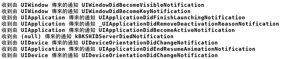 也許這樣說有些籠統,下列程式碼我們就將對 NSNotificationCenter 進行註冊的程式碼片段撰寫在 viewDidLoad 中,並且對所有訊息事件通知都進行註冊,你可以在執行結果中發現,當程式開啟時究竟觸發了多少個 NSNotification,這對於日後如果要透過相關的 NSNotification 來進行程式設計時,非常有幫助。
